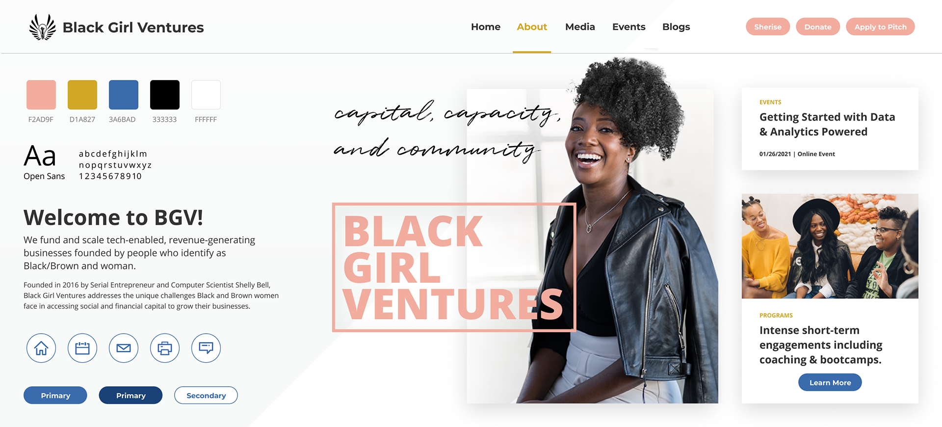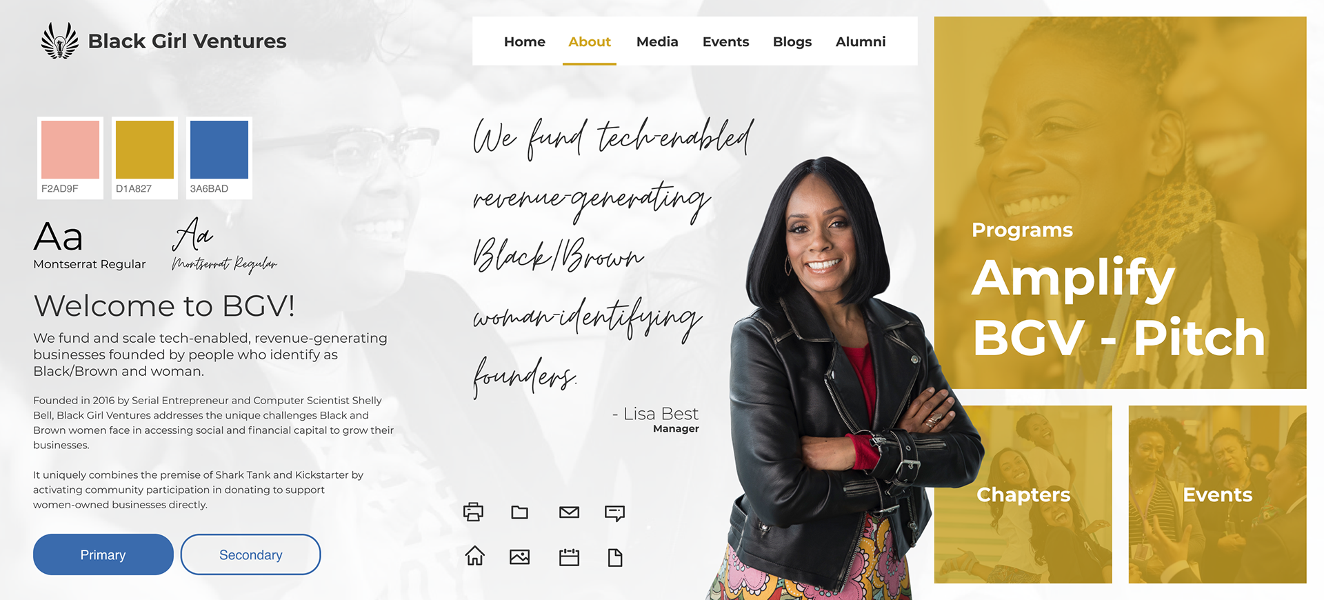 As the Lead Designer for the Black Girl Ventures website redesign, I set the creative direction to ensure the site reflected the organization’s mission of empowering Black and Brown women entrepreneurs. Before moving into full designs, I worked with the client to create a style tile, which served as the foundation for defining the visual language and ensuring consistency across the redesign.