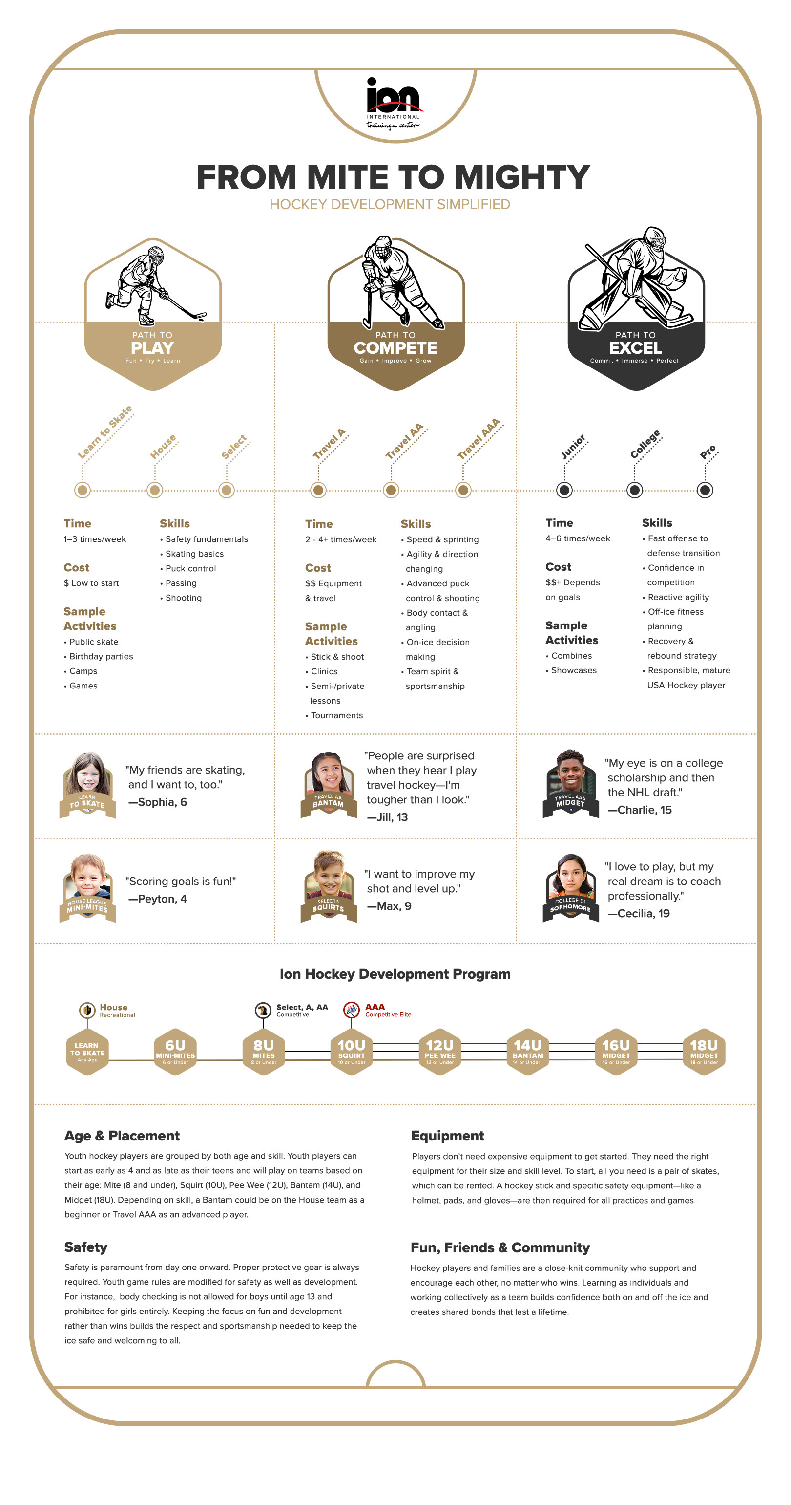 A centerpiece of this collateral was a journey map that clearly illustrated every step of player development. By blending strong visuals with concise messaging, the designs gave parents an intuitive roadmap while reinforcing Ion’s commitment to nurturing athletes at every level. The collateral not only educated families but also inspired them to see the long-term growth potential in their child’s hockey experience.