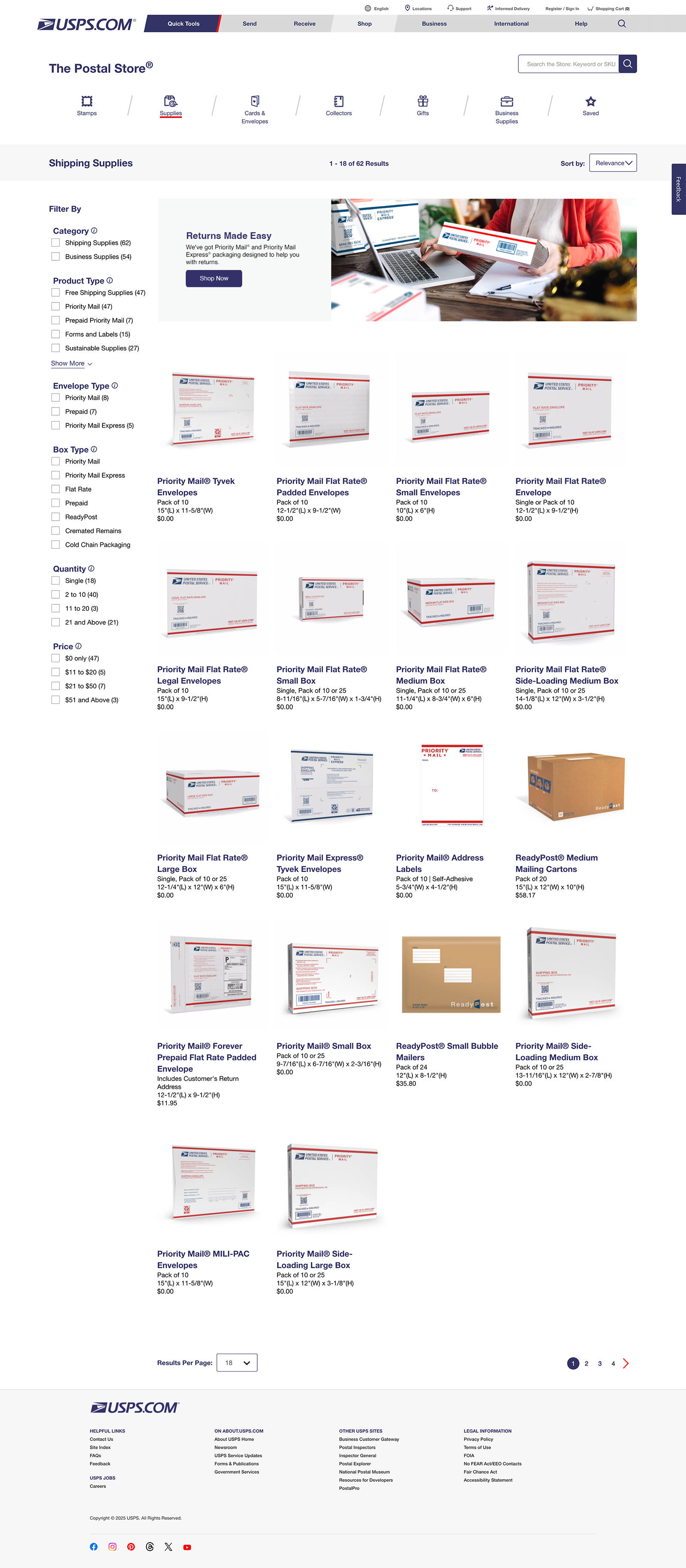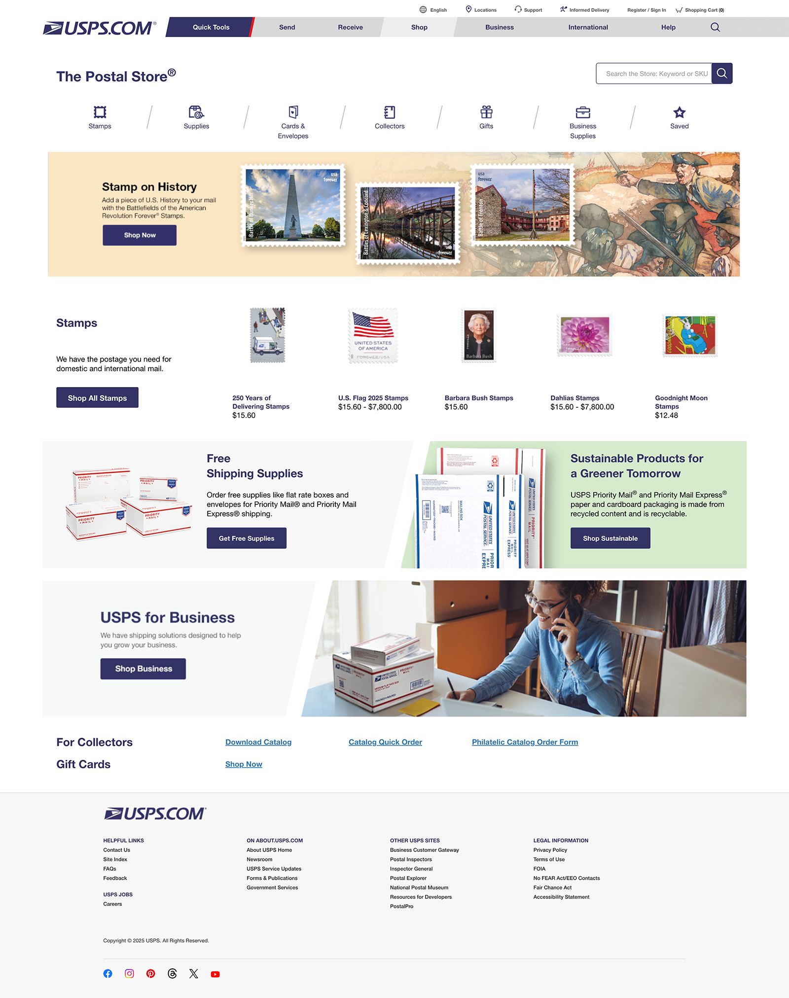 As the Lead Creative and UX Designer for the USPS Postal Store eCommerce platform, I was responsible for overseeing the visual design strategy and managing all creative assets across digital channels. This included managing product imagery, designing homepage and promotional banners, creating social media graphics, and producing marketing and transactional emails. By ensuring consistency across all brand touchpoints, I elevated the Postal Store’s digital presence while maintaining strict compliance with USPS brand standards and accessibility requirements.