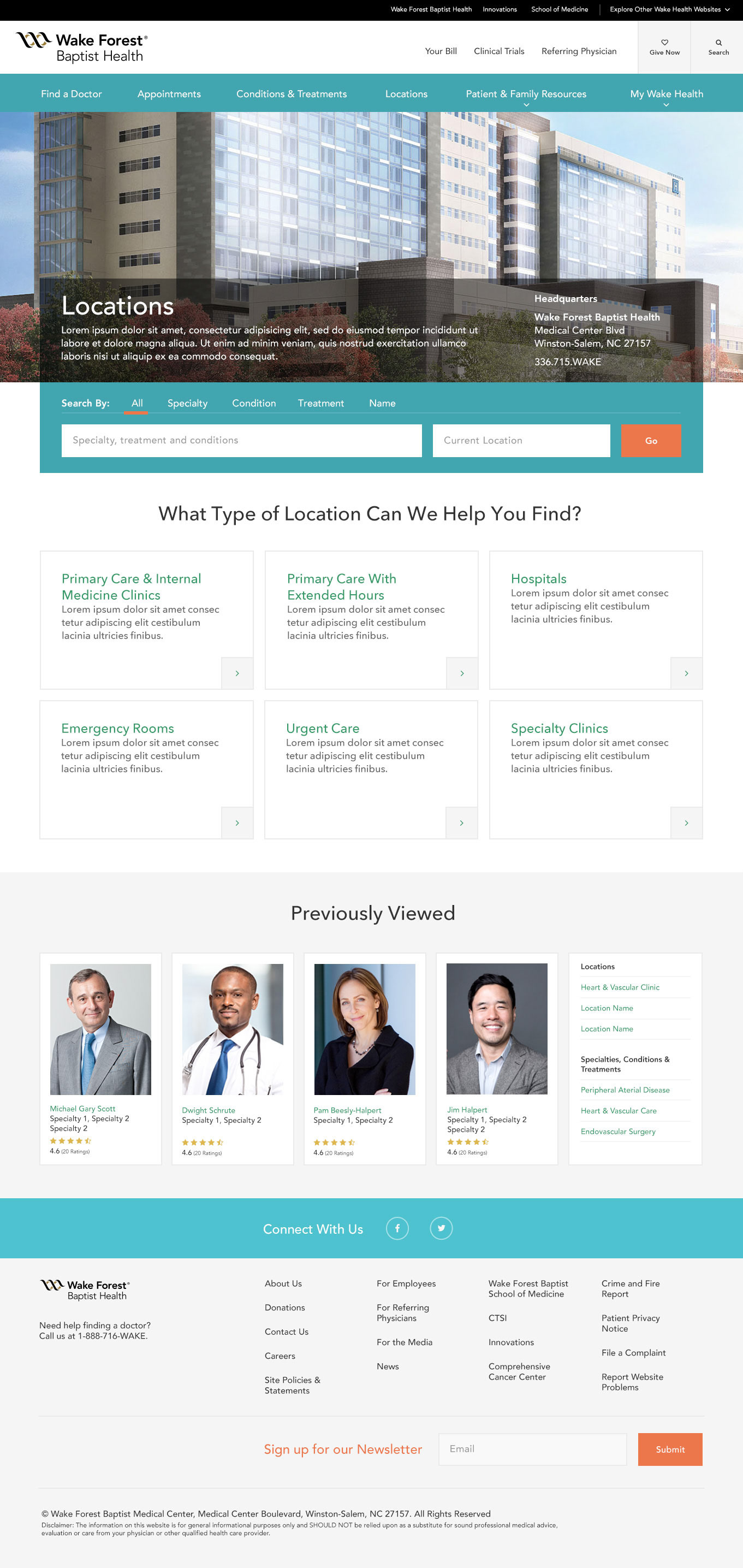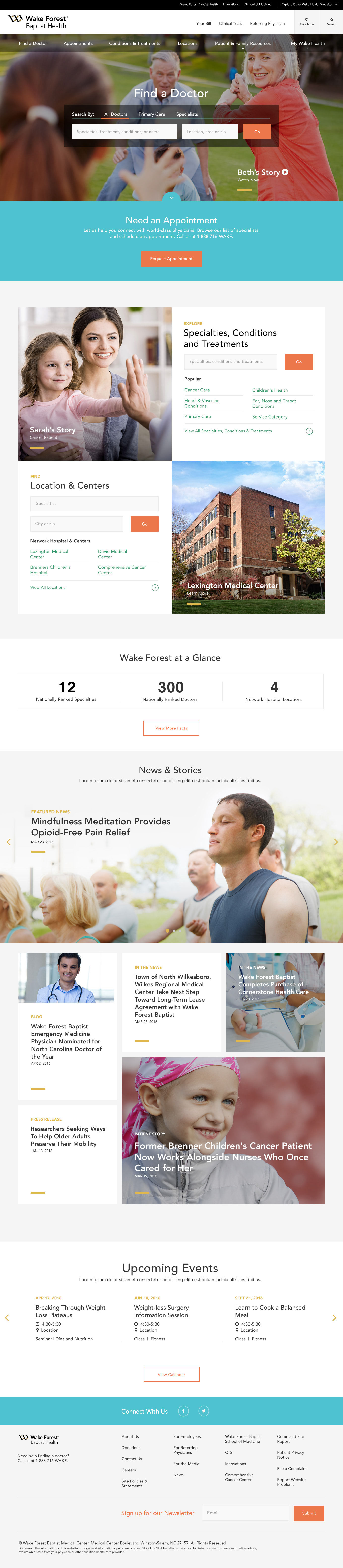As Lead Designer for the Wake Forest Baptist Health website redesign, I directed the creation of a warm and welcoming digital experience that helps users find doctors and access medical care with ease and confidence. I approached the design with empathy, recognizing that many visitors arrive feeling anxious or overwhelmed. To address this, I introduced a soft pastel color palette of light blues, warm peaches, and gentle greens that conveys calm, friendliness, and trust from the first interaction. This approach created a human centered experience that feels approachable rather than clinical.