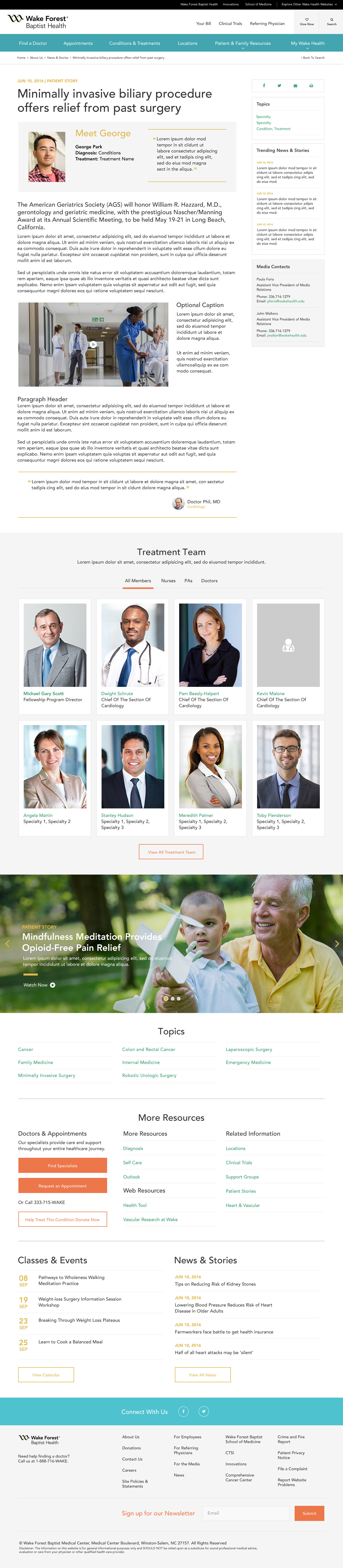 To build a deeper emotional connection, I incorporated authentic patient photography and shared personal stories of care and recovery at Wake Forest Health. These stories provided valuable insight into the patient experience while reinforcing the hospital’s commitment to compassionate, high quality care. Each profile was thoughtfully placed to inform and inspire, building trust through authenticity and transparency.